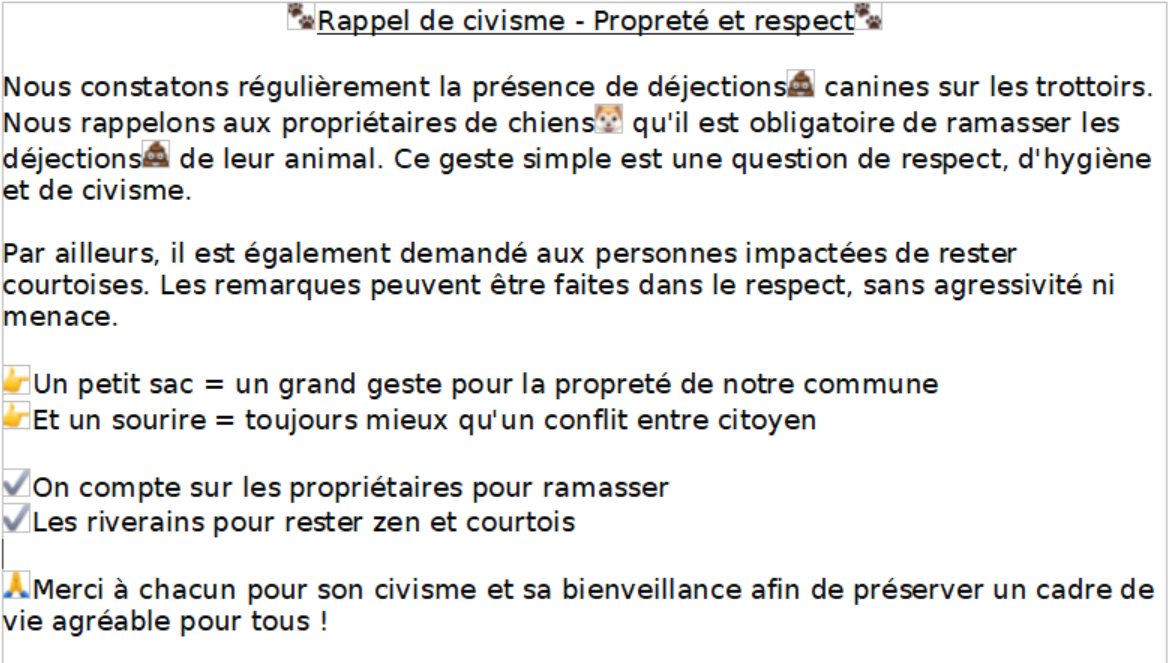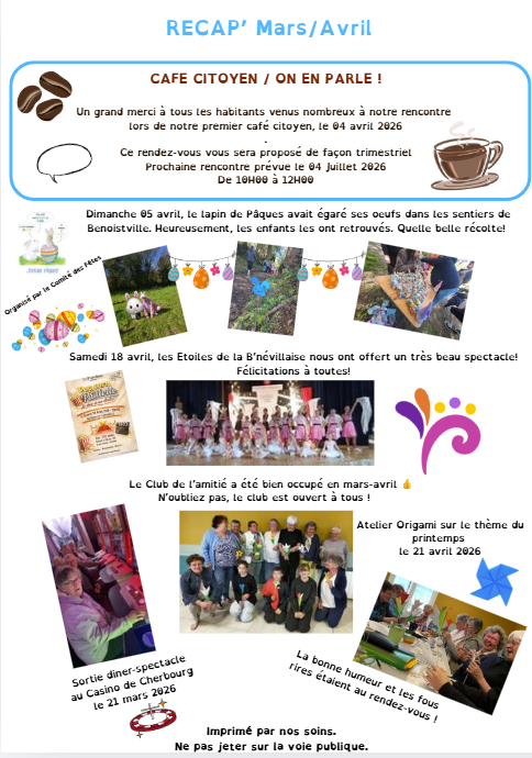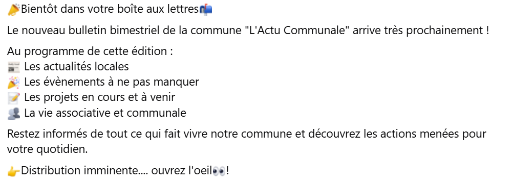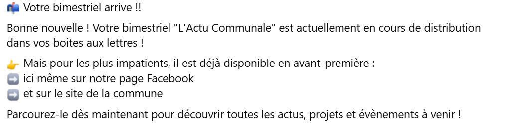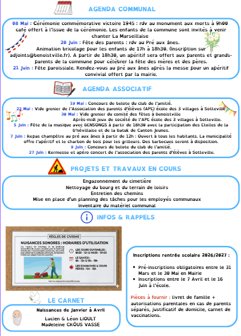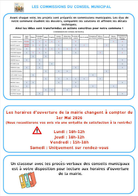 Les associations, les commerces, les artisans ,, les professionnels de santé, gîtes …les travaux de la commune et le calendrier des dates de distributions du raticide